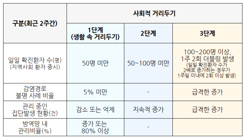 (하지만 2단계에서 3단계로 전환할 될 경우에는 사회적 저항과 경제적 손실 비용이 상당히 크기 때문에 이 경우에는 정부의 독단적인 결정이 아닌 국민과 코로나 관련 전문가 등의 사회적인 의견을 수렴하는 과정을 거친 뒤 전환된다.