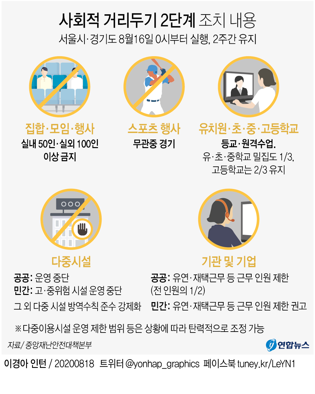 "사회적 거리두기 2단계"에서는 감염확산을 방지를 위해 실내 50명 실외 100명까지로 하며 이 이상의 많은 사람들이