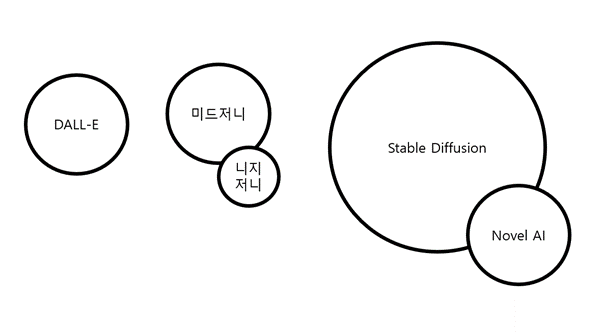 앞서 말했듯 오픈소스라는 강점이 있는 stable diffusion이 현재 매우 큰 점유율을 차지하고 있으며 매우 활발하게 모델의 개발과 공유가 이루어지고 있다.