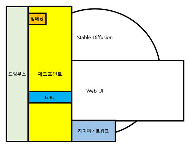 드림부스가 새로운 모델을 만드는 것이라면 로라는 기존 모델에 간섭하지 않고 레이어와 레이어 사이에 학습시킨 새로운 레이어를 추가하는 형태로 학습시키는 기술로 하이퍼네트워크와 임베딩의 상위호환급 취급을 받는 중
