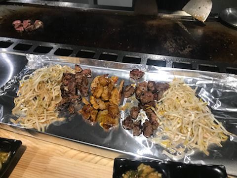 앉은 자리 바로 앞에서 부채살,갈비살,대창,곱창,숙주 철판 구이의 향연이 펼쳐짐. 소고기보다 특제 소스를 가미한 대창,곱창 구이가 더 맛있으며 맥주 한모금까지 곁들이면 을지로 핫플 도장깨기 성공