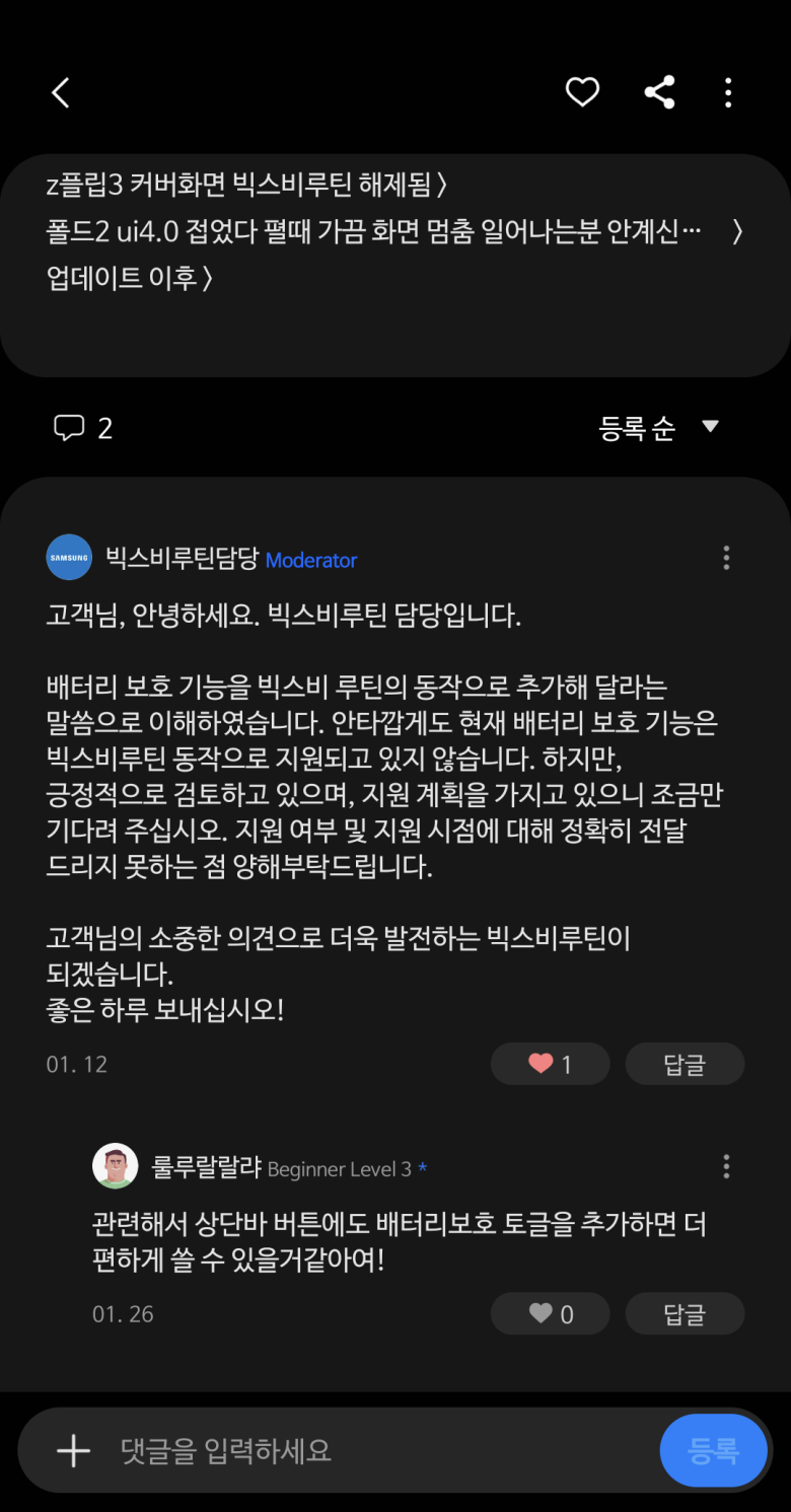 이것 때문에 추가 됐는지는 모르겠지만 예전에 배터리보호 토글을 추가해달라는 댓글을 남긴 적이 있습니다.