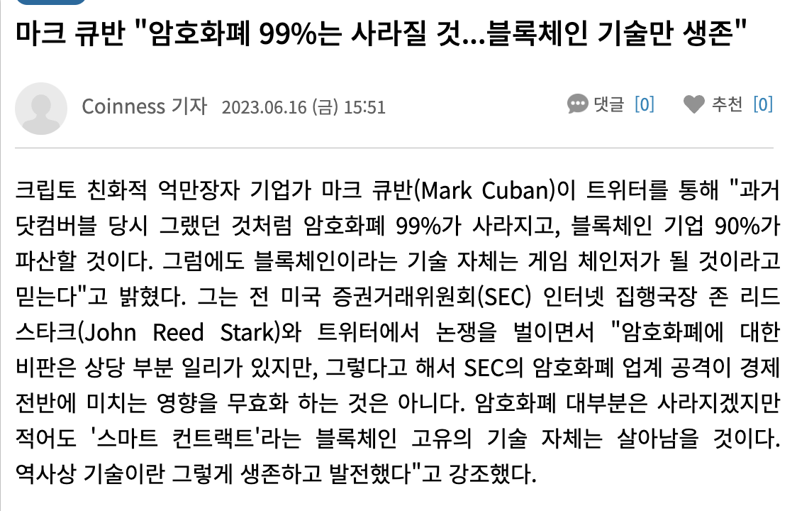 굉장히 크립토 친화적인 인물이었고 금보다 비트코인을 사겠다, 자기가 소유한 구단에서 비트코인 결제 받아주는 것은 물론 각종 알트코인(폴리곤,도지,에이브, 미러 등등)에도 공격적으로 투자했던 미국에 거물급 투자자인데 (NBA 댈러스 구단주, 샤크탱크 네임드 등) 최근 입장이 이렇더라고 이 사람뿐 아니라 투자업계에서 진짜 도움되는 정보를 알게모르게 흘려주는 사람들 이야기를 들어봐도 2~3년간은 왠만하면 비트,이더 비중 높여라 이게 중론임