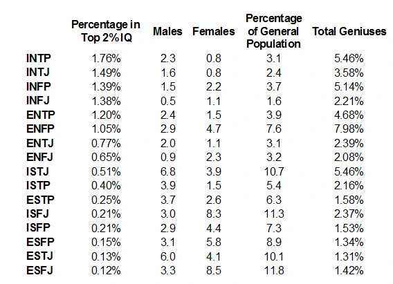 -INTJ와 INTP의 순위는 통계마다 자주 바뀜. 평균치는 INTJ가 더 안정적이지만 상위 2% 내를 기준으로 할 경우 INTP가 더 높은 평균 수치를 보임. 다만 이는 INTP쪽의 평균 지능 편차가 더 크기 때문임.
