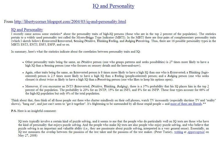 따라서 본 글은 그냥 어디까지나 '각 유형별 IQ 통계'로만 받아들여 주었으면 좋겠음. 어느 유형이 더 우월하냐, 더 열등하냐는 무의미하며 뒤틀린 소속감이자 지나친 일반화의 오류에 불과함.