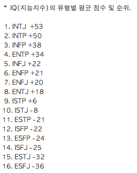-가장 표본이 많은 미국 통계상으로 평균 IQ 순위는 INTP가 1위, INTJ가 2위 그리고 INFP랑 INFJ가 각각 3위, 4위고 그 뒤로 ENTP(5위) ENFP(6위) ENTJ(7위) ENFJ(8위)를 차지함. 1위부터 4위까지는 상위 2%내를 기준으로 할 경우에도 거의 위 통계와 일치함.