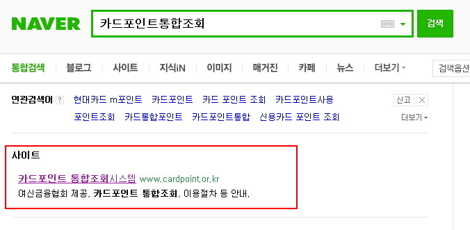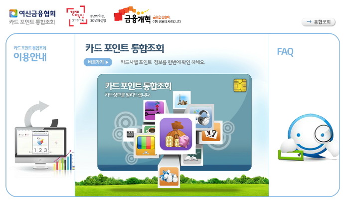 사이트에 접속하시면 3가지로 구분되어 있습니다. 이용안내, 카드 포인트 통합조회, FAQ. 그 중에서 카드 포인트 통합조회 란에서 바로가기 버튼을 클릭하세요.
