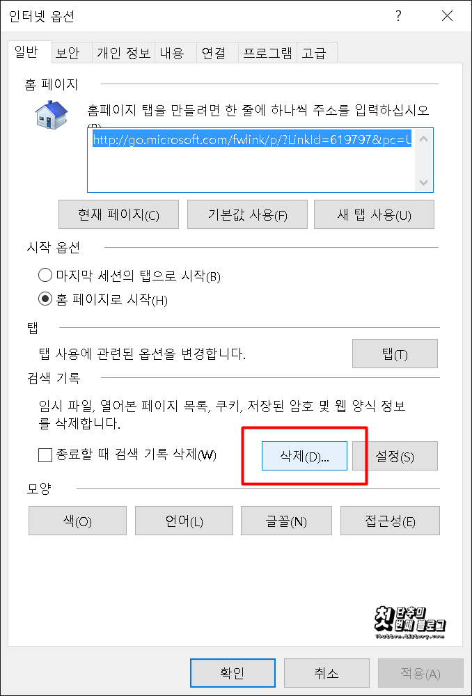인터넷 옵션에 들어오셨나요? 글들을 내려 보시면 검색기록이라는 탭이 있습니다. 거기서 '삭제' 버튼을 눌러주세요.