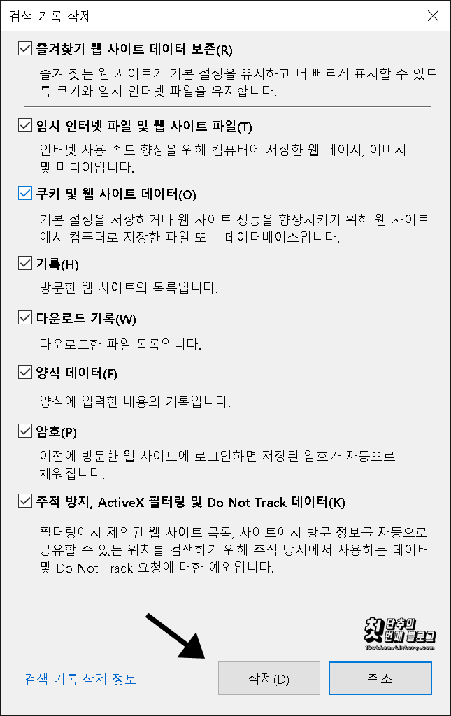 여기서 여러분들이 삭제할 인터넷 검색기록이나 데이터 파일 등을 선택할수 있습니다. 선택이 완료되었다면 삭제 버튼을 눌러 인터넷 검색기록을 깔끔히 삭제하시면 됩니다. 만약 컴퓨터가 종료될 때마다 인터넷 검색기록을 삭제하고 싶으시다면, 아까 찾았던 검색기록 탭에서 '종료할 때 검색기록 삭제'에 체크해 주시면 된답니다.