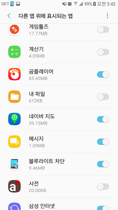 "화면 오버레이 감지됨" 체크 앱 리스트
