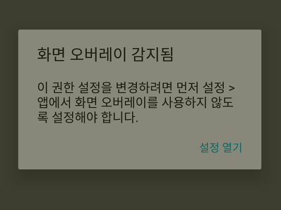 "화면 오버레이 감지됨"은 화면에 무언가 덮여있다는 의미입니다.