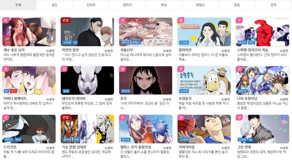 | 웹툰 장르 | 성인, 드라마, BL, 로맨스, 판타지, 무협, 학원물 |