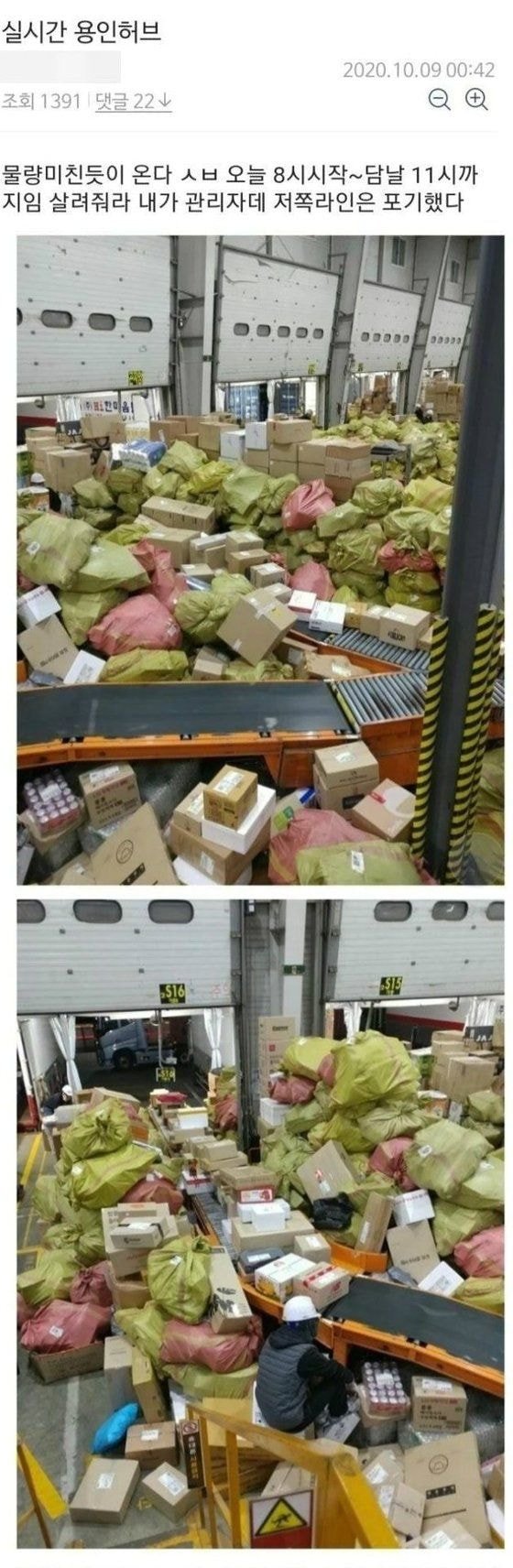 CJ대한통운 물류대란이 화제다. 최근 “추석 전 주문한 물건이 아직도 오지 않는다”는 불만이 일부 인터넷 커뮤니티에서 제기됐고, “다른 택배사보다 유독 대한통운이 심하다”는 동조도 잇따르면서 언론 보도로도 이어졌다. 한 커뮤니티에선 “상·하차하겠다는 아르바이트도 없고, 관리자들도 사실상 내려놓은 상태”라는 설명과 함께 ‘CJ대한통운 용인허브’ 모습이라며 택배 상자들이 어지럽게 널려있는 사진도 여러장 게시됐다.