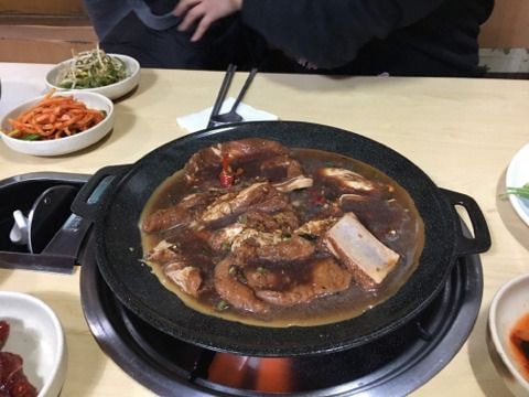 연탄에서 구워져 나오는 돼지갈비가 생각보다 존맛이며 고추장에 찍어 먹는 것이 매력적임