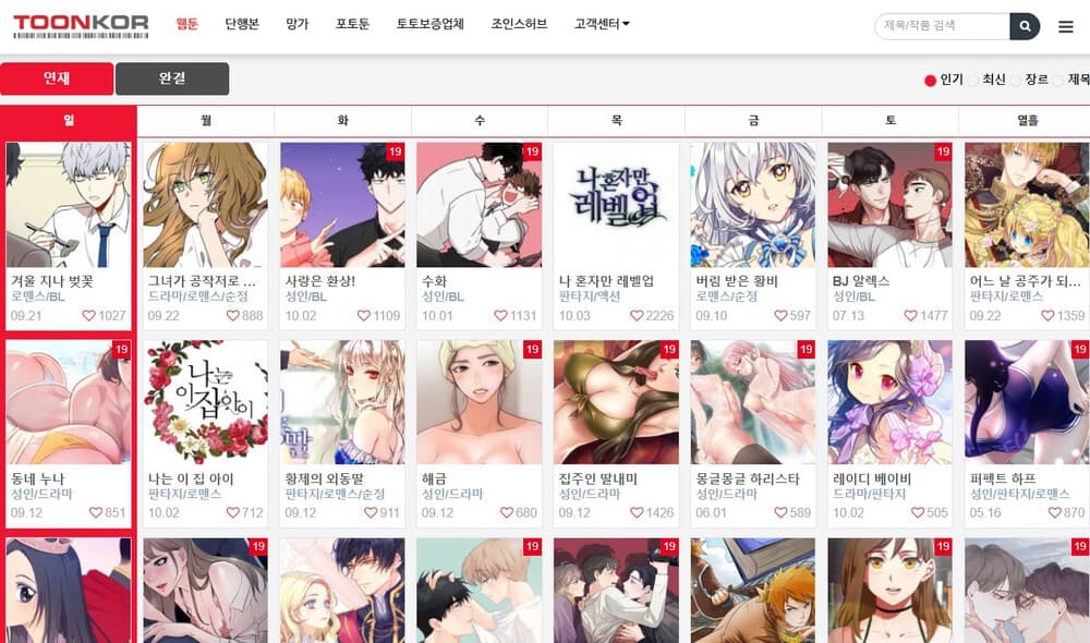 - 무료 웹툰 보기 사이트 툰코는 웹툰을 요일별 연재와 완결로 나누어 제공하고 있습니다