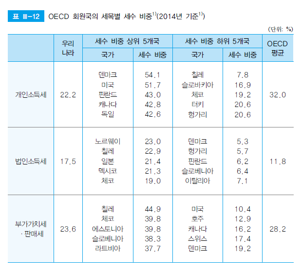 복지가 우수한 선진국에서 소득세가 차지하는 비중이 40~50%로 한국의 2배다. 법인세가 차지하는 비중도 평균의 1.5배다.