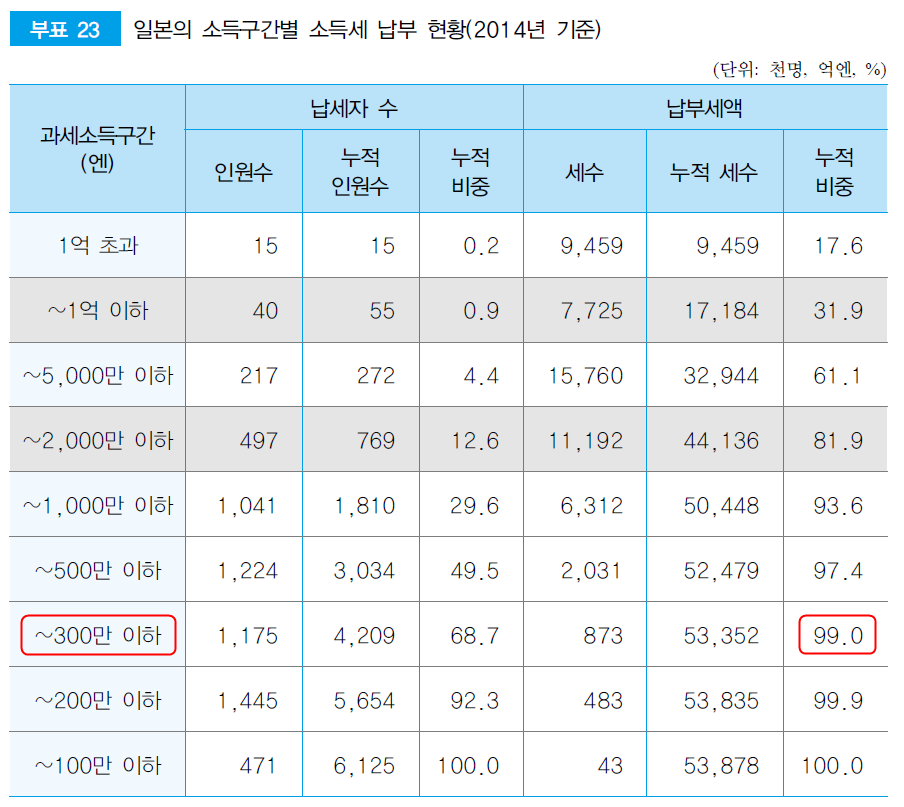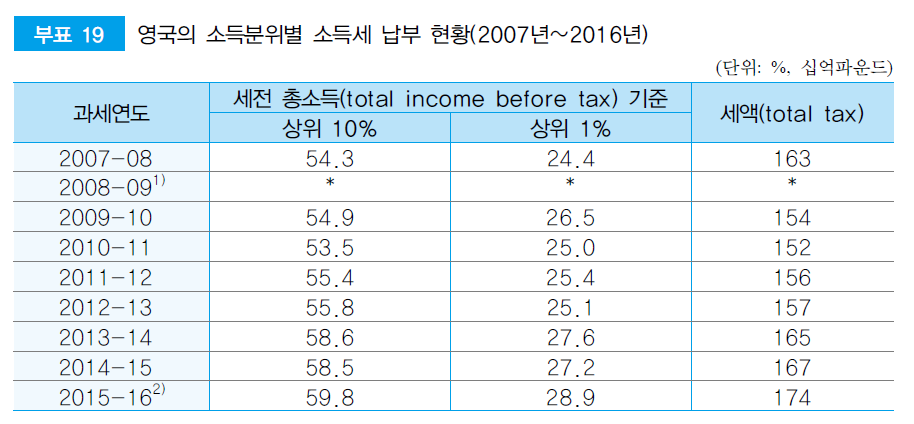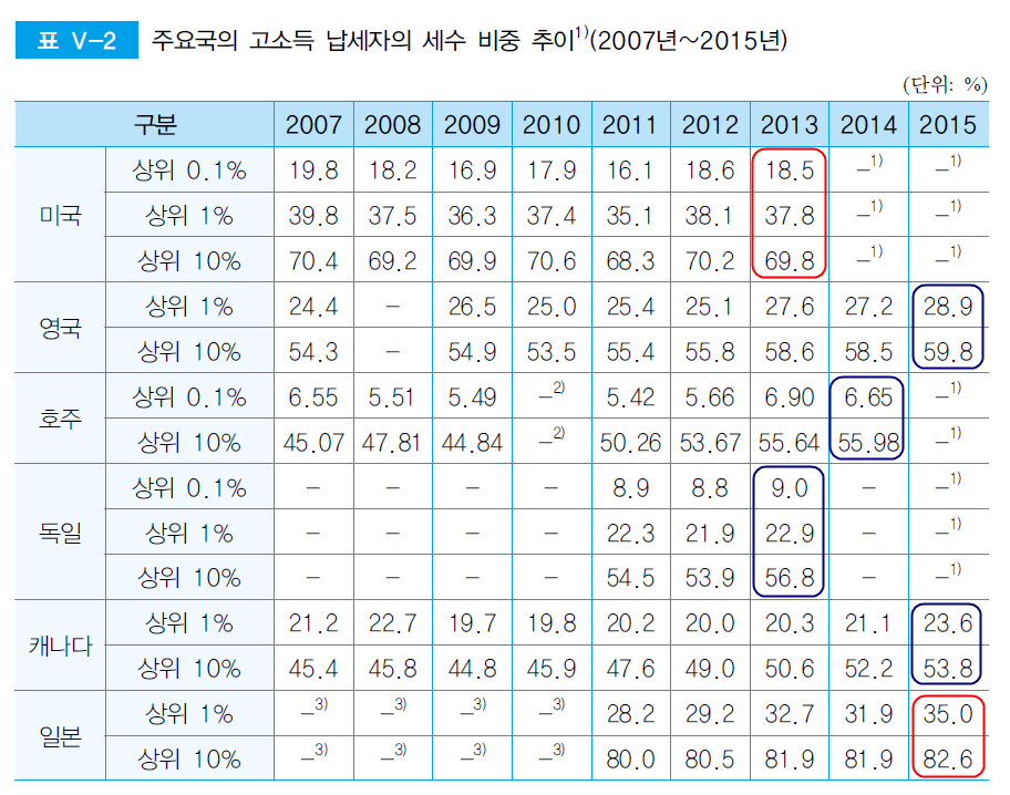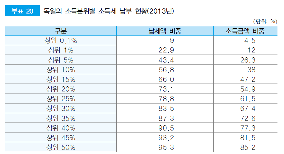 상위 10%의 소득세 비중은 일본이 80%, 미국이 70%, 유럽이나 캐나다는 50~60%이다. 상위 1%의 소득세 비중은 독일(23%)과 영국(29%)이 낮고 미국(38%)과 일본(35%)이 높다.