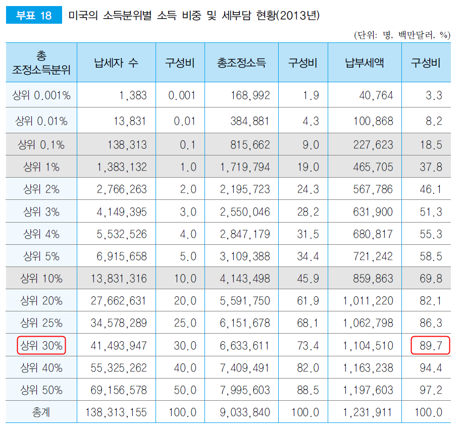 한국은 소득 상위 10%가 소득세의 90%를 낸다. 1%는 50% 가까이 부담하고 있다. 통계 방법에 따라 수치차이가 있지만 외국에 비하여 부자가 부담하는 세금이 상당히 높다는 점은 사실이다.