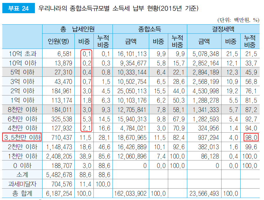 2015년 진보진영의 김모 교수가 이런 말을 하였다. 1600만의 근로자중 절반가까이가 세금을 안낸다. 이런것에 침묵하면서 부자·대기업 증세를 말하는 것은 사기다. 소득이 있으면 최소한 세금을 내야하고, 그 다음에 부자들에게 돈을 더 내라고 말할수 있다는 내용이다.