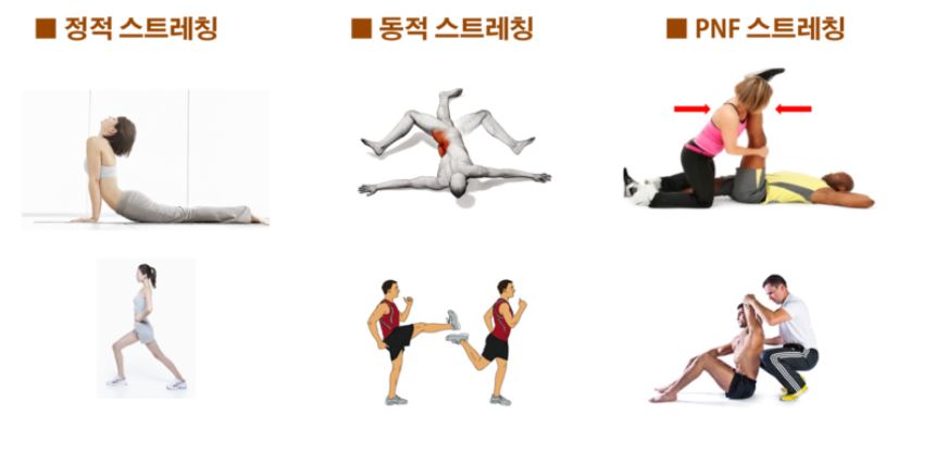 그리고 근막 이완과 동시에 스트레칭도 별개로 진행해줘야해. 스트레칭의 종류에는 정적 스트레칭, 동적 스트레칭, 그리고 PNF 스트레칭(고유수용성 신경근촉진법)이 있는데 PNF는 생략할게. 저거는 보조자가 있어야하거든.