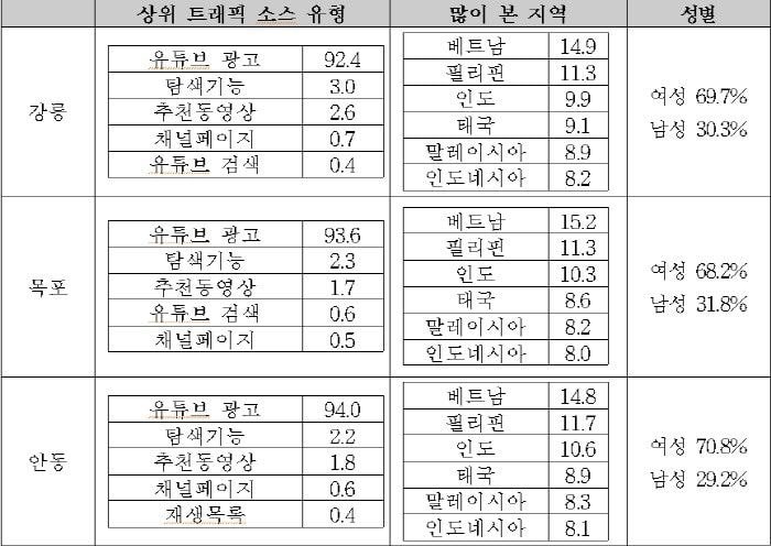 29일 김예지 국민의힘 의원실이 입수한 자료에 따르면 한국관광공사에서 제작한 한국의 리듬을 느껴보세요 강릉편 조회수의 92.4%가 유튜브 광고인 것으로 드러났다. 목포편과 안동편은 각각 93.6%, 94%였다. 시간이 지나면서 자연적으로 시청한 조회수가 늘어난 서울편만 79%였고 부산과 전주편도 90%에 육박했다. 특히 미리보기 이미지와 텍스트로 구성된 `트루뷰 디스커버리 상품`을 이용한 조회수도 7천600만회에 달했다. 이 경우 광고를 클릭해 영상이 재생되기 시작하면 조회수가 집계된다.
