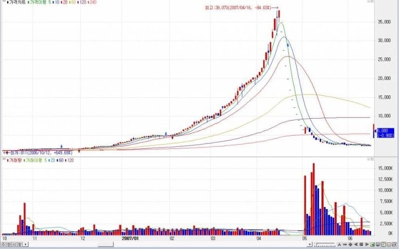 이건 루보라는 주식 차트야 물론 지금은 없어. 너도 나도 광기에 올라탔다가 많이 잃은 사람 많아.