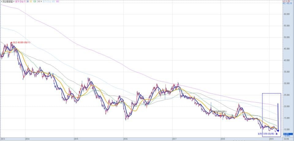 이건 아직도 살아있는 두산중공업 2013년~2019년 차트야 이거 존버하면 먹을 수 있어?