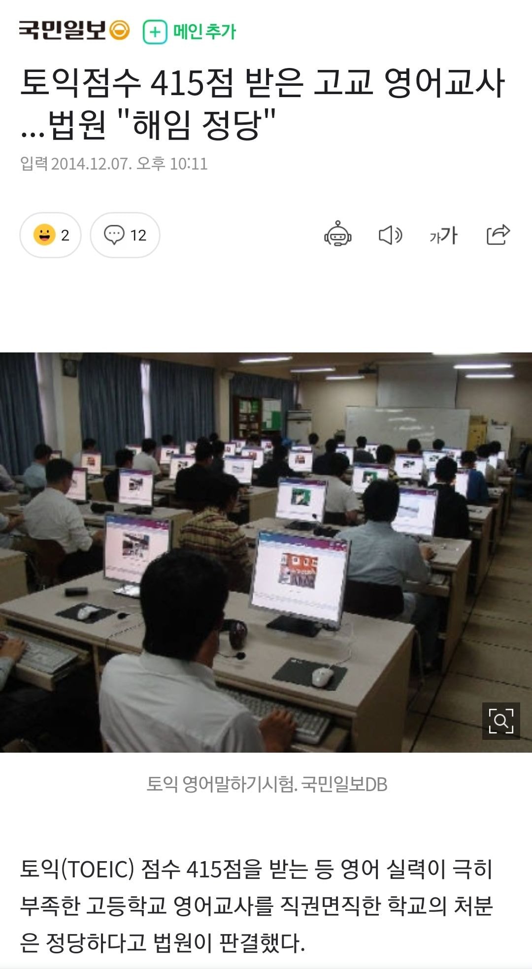서울고법 행정5부(부장판사 조용구)는 “학교 측이 A씨를 직권 면직한 처분은 정당하다”며 원심처럼 원고 승소 판결했다고 7일 밝혔다. 재판부는 “A씨는 수업능력이 다소 부족한 것을 넘어 영어교사로서 근무 성적이 매우 불량했던 것으로 평가된다”고 설명했다. 또 “A씨의 토익 성적은 교육업 종사자의 평균 성적에 비해 250점 이상 낮아 고등학교 영어교사에게 통상 기대되는 수준에 현저히 미치지 못한다”고 덧붙였다.