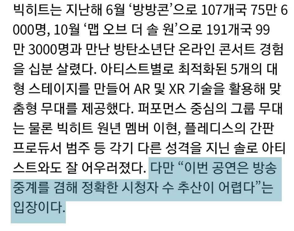 빅히트는 지난해 6월 ‘방방콘’으로 107개국 75만 6000명, 10월 ‘맵 오브 더 솔 원’으로 191개국 99만 3000명과 만난 방탄소년단 온라인 콘서트 경험을 십분 살렸다. 아티스트별로 최적화된 5개의 대형 스테이지를 만들어 AR 및 XR 기술을 활용해 맞춤형 무대를 제공했다. 퍼포먼스 중심의 그룹 무대는 물론 빅히트 원년 멤버 이현, 플레디스의 간판 프로듀서 범주 등 각기 다른 성격을 지닌 솔로 아티스트와도 잘 어우러졌다. 다만 “이번 공연은 방송 중계를 겸해 정확한 시청자 수 추산이 어렵다”는 입장이다.