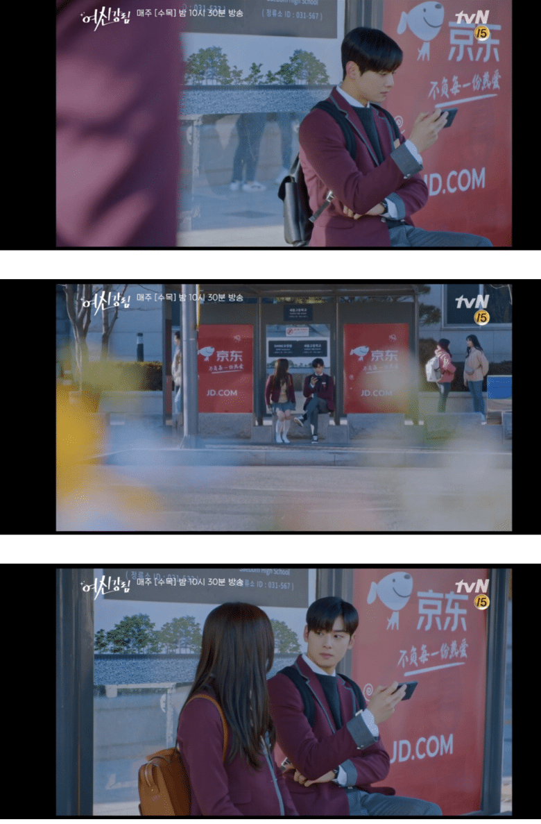 남주가 앉아있는 정류장에 중궈 웹사이트 광고 PPL
