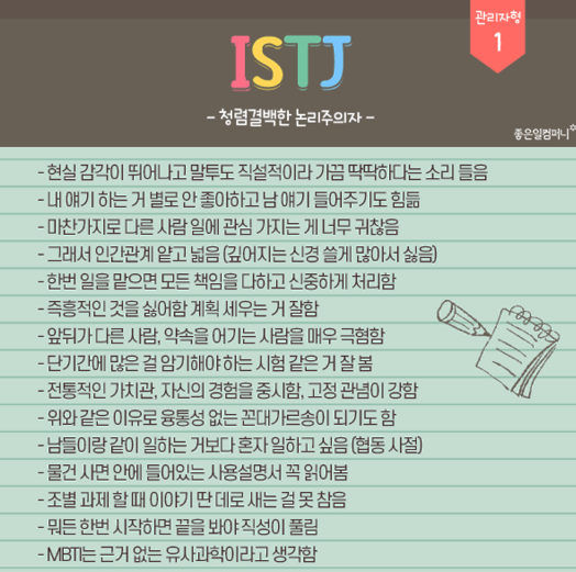 ISTJ 특징은 I내향형 S감각형 T사고형 J판단형입니다.