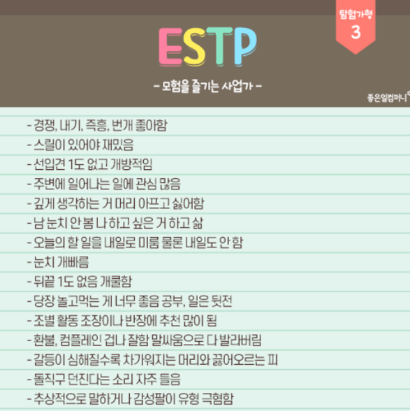 솔직하고 밝은 ESTP 유형은, 이해한다면 되게 매력적이고 좋은 성격인 것 같아요!
