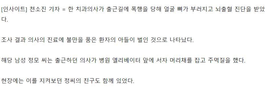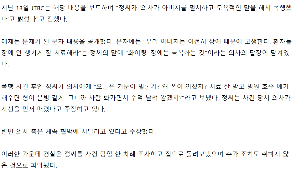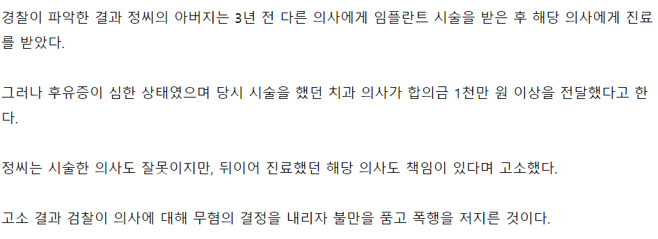 ** 다른데서 댓글보니까 와이티엔 뉴스에 폭행 가해자쪽 인터뷰 나왔다는데 저 맞은 의사한테 갔더니 큰 병원 가라고 하지도 않고 진통제만 계속 처방하면서 방치했대 그러다 너무 힘들어서 나중에 다른 병원 갔더니 임플란트 시술할때 잘못돼서 신경 손상된거 같다고 했다고 시술한 의사 말고 저 사람도 잘못이 있는데 저렇게 뻔뻔하게 나와서 빡친듯