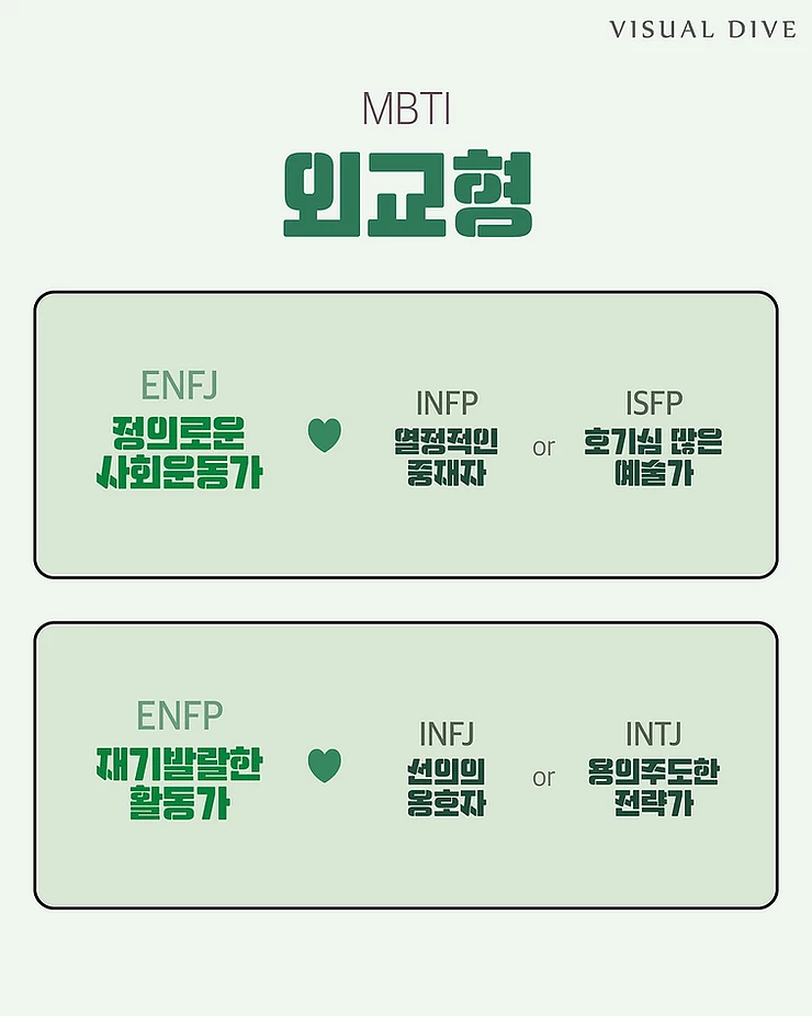 ESFP 연애를 하면 무조건 연인이 1순위 사랑에 가장 열정적이며 의외로 이별에 대해서 미련이 없음 ESFJ 주변에 이성친구가 많음 주로 알고 지냈던 친구와 연애를 시작하며 안정적이고 길게 연애함 ENTP 바람 필 확률이 높은 편 항상 연애의 경우의 수를 따짐 ENTJ 주도적으로 연애를 이끔 ENFP 이성에게 인기가 많기 때문에 주변에 잇어이 끊이질 않음 첫인상이 좋아 소개팅에서 만나 잘 될 확률 높음